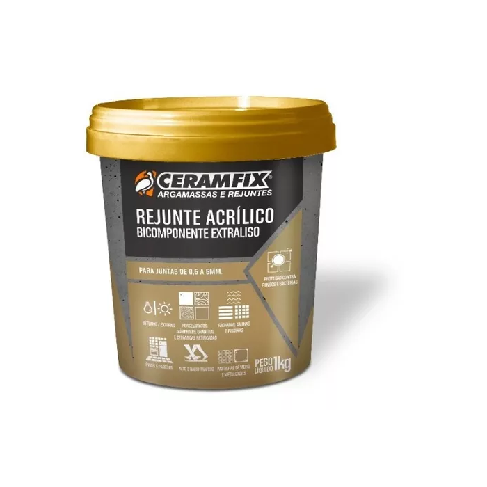 O Rejunte Acrílico Bicomponente Extraliso Ceramfix é uma argamassa de rejuntamento especial que possui em sua composição resinas acrílicas, aglomerantes e cargas minerais. É próprio para aplicação em juntas de 0,5 a 5 mm, é de fácil aplicação e acabamento extraliso. O produto é indicado para porcelanatos, mármores, granitos e cerâmicas retificadas. Devido a sua alta aditivação possui excelente aderência, resistência mecânica, flexibilidade, baixa absorção e proteção contra fungos e bactérias. Não contém areia em sua composição e por isso oferece um acabamento extraliso, cores uniformes e permanentes.