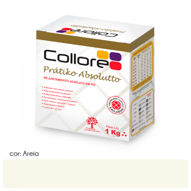 O Rejuntamento Collore Pratiko Absolutto é formulado à base de Ligantes, Agregados Minerais Beneficiados, Pigmentos Inorgânicos, Aditivos e Resinas Especiais. Tipo II.