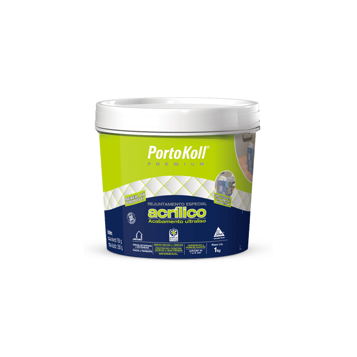 Rejuntamento Acrílico bicomponente Portokoll Premium é um produto de aditivação superior que confere alto desempenho, textura fina, acabamento ultraliso e resistência à formação de fungos. Prático de usar, basta misturar os componentes contidos no balde, aplicar com uma espátula e dar acabamento com uma esponja umedecida (conforme instruções da embalagem). Um produto superior, que não desbota, não trinca e não retrai.
