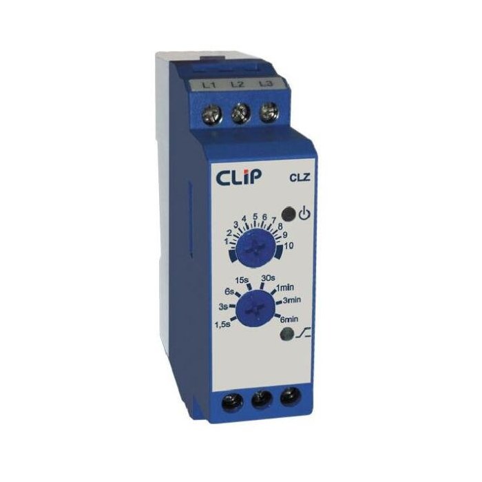 CLZ Totalmente digital e Microprocessado. Alimentação 12 Vcc/Vca ou 24 a 242 Vca/Vcc. Função Retardo na desernegização. Escalas ajustáveis no frontal de 3 seg até 10min. Caixa compacta em ABS V0 (22,5 x 85mm) Fixação em trilho DIN 35mm.