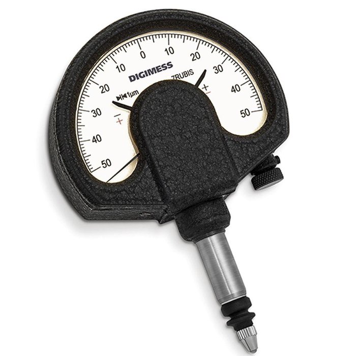 Relógio Comparador Tipo Meia Lua - Cap. +-0,050 mm - Graduação De 0,001mm - Ref.121.334 - DIGIMESS O Relógio Comparador é um instrumento de medição por comparação, dotado de uma escala e um ponteiro, ligados por mecanismos diversos a uma ponta de contato. ESPECIFICAÇÕES: - Possuem alta precisão e estrutura super leve;- Mecanismo anti choque, montado sobre 7 rubis;- Ponta de contato esférica Ø2,5mm em aço temperado;- Com marcadores de tolerância;- Com ajuste fino;- Com cabo flexível de acionamento;- Proteção contra entrada de poeira e fluídos no fuso;- Canhão de Ø8mm;- Graduação de 0,001mm.