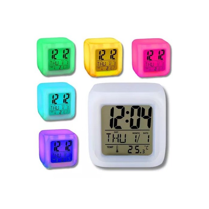 Possui mudança automática de 7 cores (LED) diferentes e você pode desligar quando quiser, marca a hora; data; semana; temperatura e também funciona como luminária.
