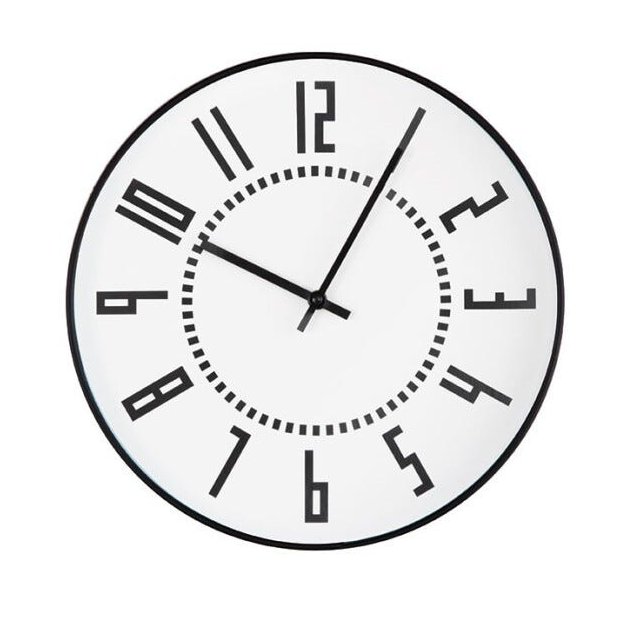<p>Relógio de parede em plástico na cor Preta com textura fosca, fundo na cor Branca, números pintados de Preta e ponteiros em metal na cor Preta, frente do relógio em acrílico incolor. </p>