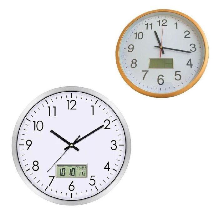 Relógio de Parede com Calendário e Termômetro Digital Estilo Alumínio Prata para Escritório e