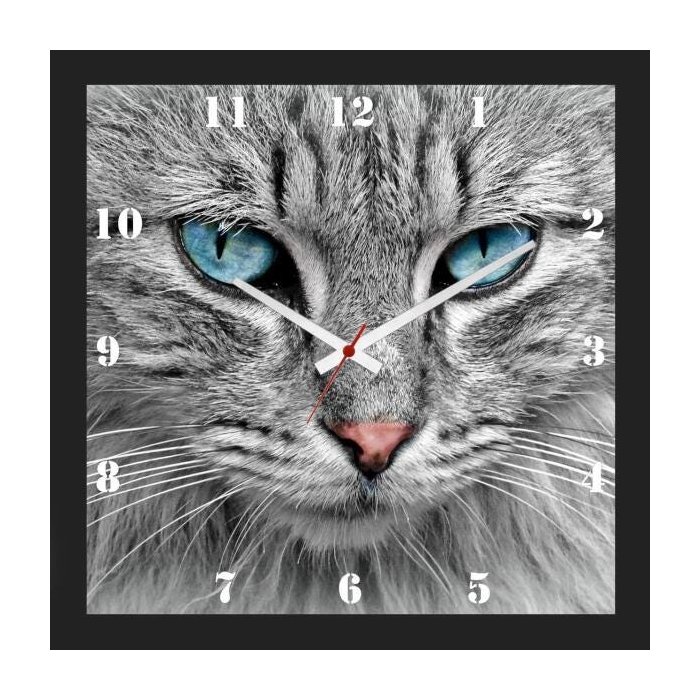 de gato cinza com olhos azuis. Relógio quadrado moderno do seu pet