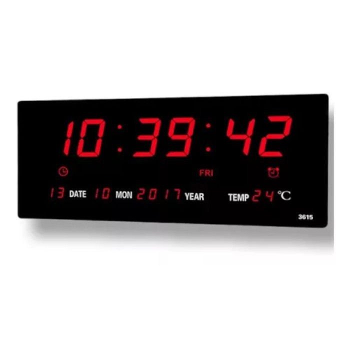 Relógio De Parede LED DigitalCaracterísticas do produto:Excelente nitidezCor dos Leds: VermelhoTensão da fonte: 110v / 220v (Bivolt)Ajuste fácil, através dos botões na parte inferior traseiraMarca a hora/minutos/segundos, dia do mês/mês/ano, dia da semana, temperaturaHora: 12/24hSistema eletrônico de quartzPossui bateria interna para manter memória em caso de falta de energia ( bateria não incluida )Visor de led proporciona visibilidade nítida no escuroCor do Relógio: PretoDimensões aproximadas do produto:Comprimento: 36 cmAltura: 15 cmLargura: 3 cmItens Inclusos:1 Relógio com visor de LED1 Fonte de energia (bivolt)