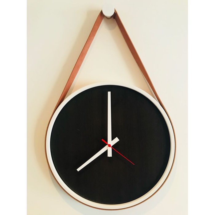 Relógio Decorativo Adnet Branco Alça Corino Caramelo Mostrador Preto Ponteiro Branco 20cm Redondo