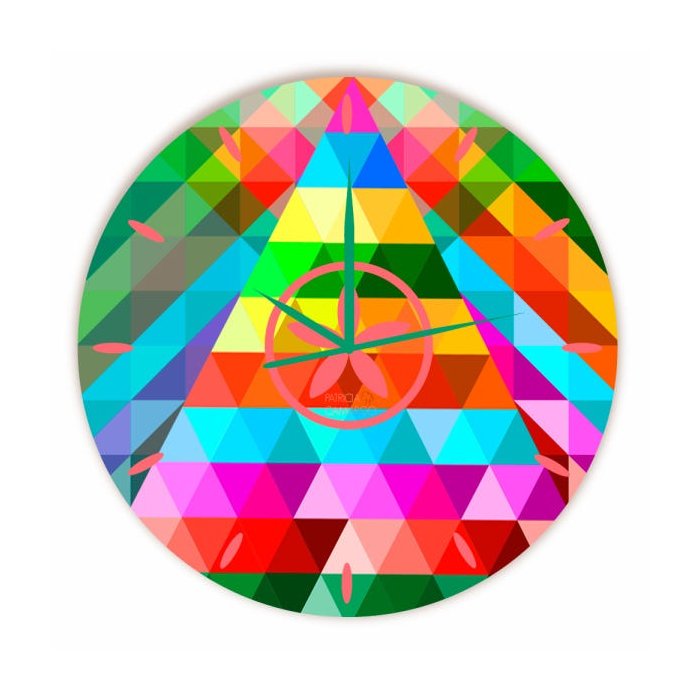 Relógio mil pirâmides redondo -Coloque mais arte em seu tempo! Este relógio com trabalho artístico de sua escolha irá dar mais graça aos seus 86400 segundos diários. Pendure-o ou colecione! Detalhes: - Frente impressa com trabalho de arte, - Movimento de quartzo, - Hardware de montagem incluído (Pilha NÃO inclusa), -Produzido em Polietileno resistente a queda e umidade,- Não utilizar material abrasivo na limpeza, - Artista: Patricia Camargo, - Data estimada do envio: 8 - 15 dias úteis