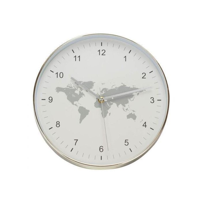 Relógio de parede borda prateada, formato circular com 30 x 30 cm de dimensão, estampado com mapa mundi.