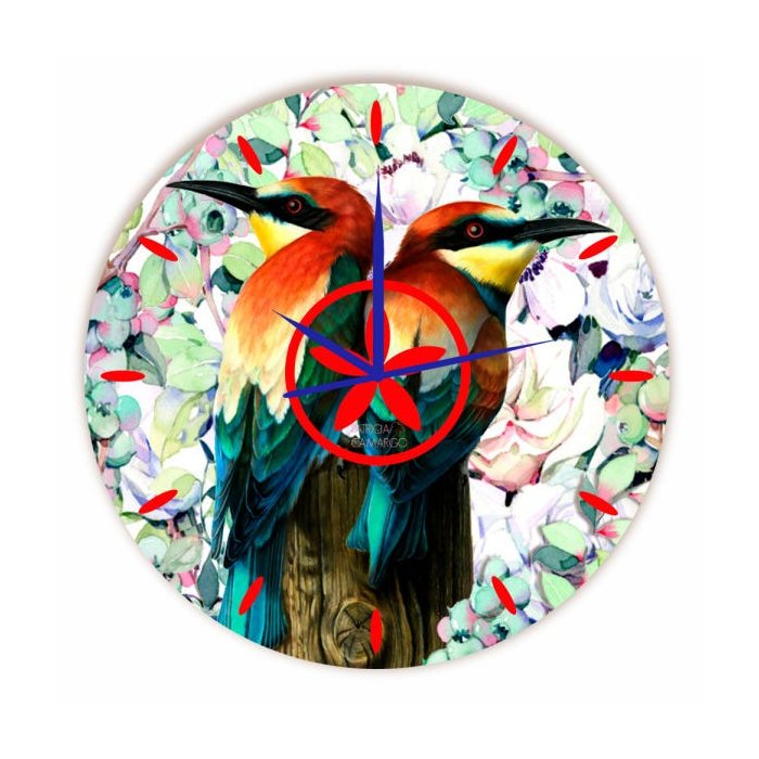 Relógio pássaros redondo - Coloque mais arte em seu tempo! Este relógio com trabalho artístico de sua escolha irá dar mais graça aos seus 86400 segundos diários. Pendure-o ou colecione! Detalhes: - Frente impressa com trabalho de arte, - Movimento de quartzo, - Hardware de montagem incluído (Pilha NÃO inclusa), -Produzido em Polietileno resistente a queda e umidade,- Não utilizar material abrasivo na limpeza, - Artista: Patricia Camargo, - Data estimada do envio: 8 - 15 dias úteis