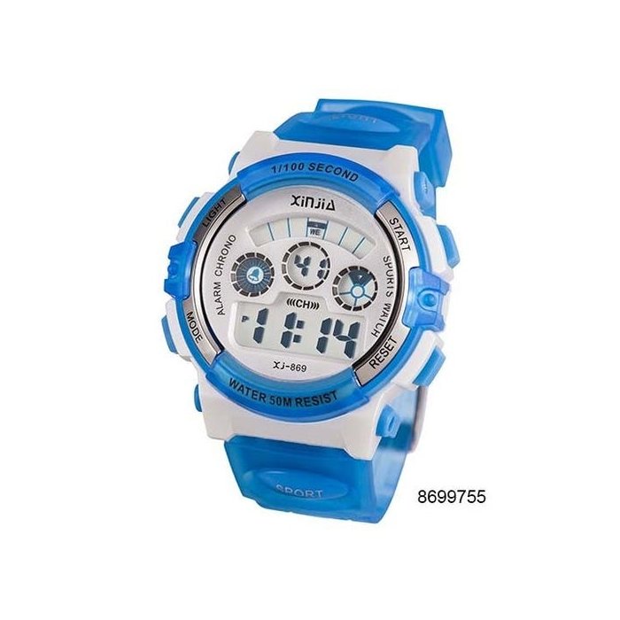 ***AVISO:ESTAMOS TRABALHANDO NORMALMENTE COM TODOS ITENS COM ENVIO IMEDIATO***Relógio Infantil Digital Xinjia Xj-869 Azul Prova d'água Relógio Digital Xinjia Xj-869 Tipo de display: LCD digitos Diâmetro: 44.5mm Espessura da caixa: 17mm Comprimento da cinta: 240mm Material da cinta: resina forte tpu Prova d''água: 40 m resistente a água Natação e Mergulho permitidos. Atenção: Não pressionar qualquer botão debaixo d''água!Material: Caso: ABS Correia: TPU Vidro: PMMA (acrílico). Voltar caso: aço inoxidável Fivela: aço inoxidável Funções e características: Com o tempo, data, semana Alarme diário, soneca Cronômetro: (1/100) segundos de começo/parada) Back light formato de 12/24 horas.