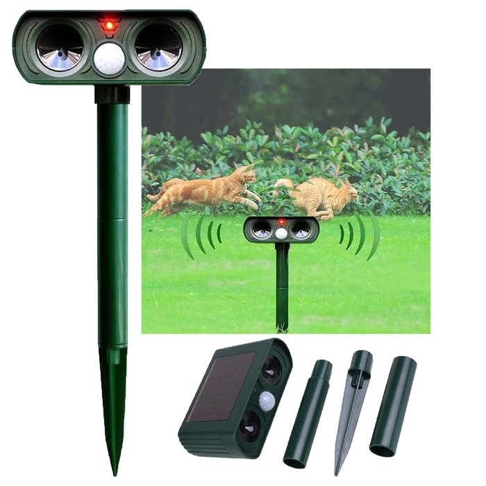- Sensor infravermelho passivo (PIR) detecta o movimento de desencadeia uma onda ultra-sônica, que emite um tom que pessoas não podem ouvir, mas afugenta pragas, cães, gatos, raposas, veados, ratos, gambas e muito mais.