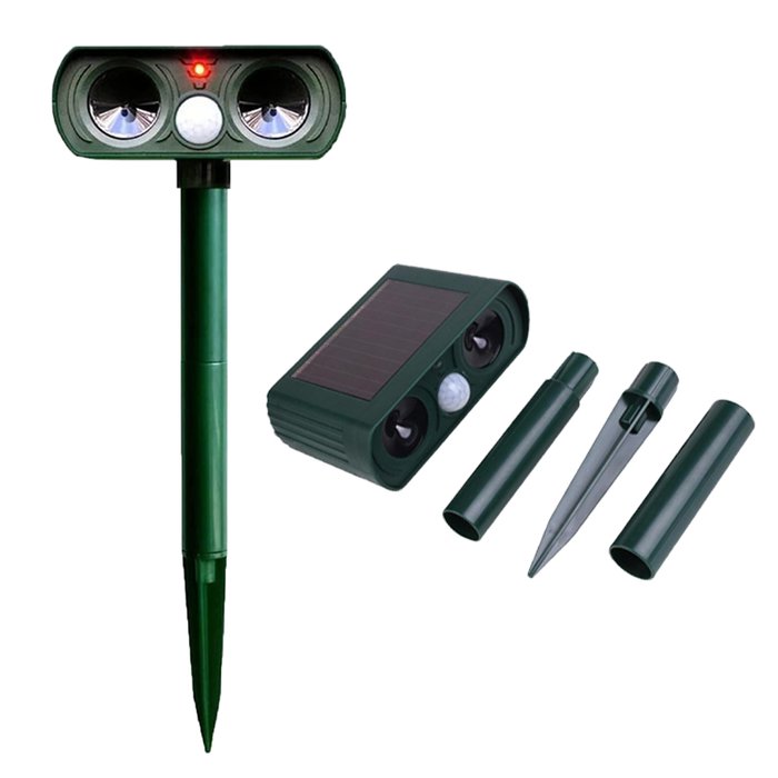 Utiliza som ultrassônico e tecnologia de detecção de infravermelho para manter os animais longe. Alimentação Solar com bateria Ni-MH recarregável com a luz do Sol.