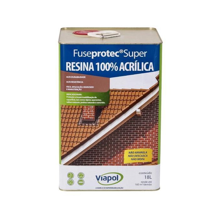 Resina Fuseprotec Super Viapol é uma resina acrílica pura de alto desempenho, transparente, resistente ao intemperismo e a água, não amarela e nem descasca. É indicada para aplicação em fachadas, paredes internas e externas, estruturas de concreto aparente, tijolos aparentes, pedras naturais com porosidade, telhas cerâmicas naturais, telhas de fibrocimento, etc.