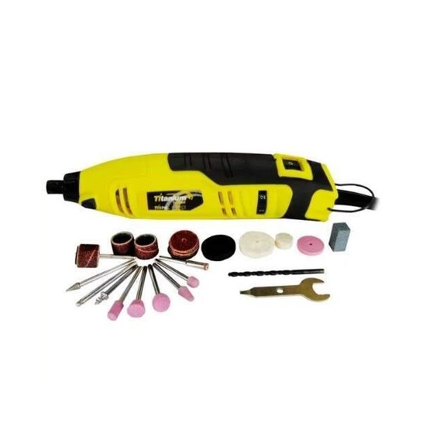Descrição do ProdutoMicro retífica é indicada para pequenos trabalhos que exigem perfeição e acabamentos pequenos. Acompanha 40 acessórios, oferecendo alta qualidade e performance. Especificações Técnicas -Tensão: 220V-Potência: 170W-Rotação: 8000 a 32500RPM-Dupla Isolação-Trava Eixo Conteúdo da Embalagem -1 Micro Retífica-5 Hastes com pedra para desbaste -3 Lixas redondas -1 Roda para desbaste -1 Broca de aço rápido-2 Pontas diamantadas-1 Haste de feltro-1 Haste para disco de lixas -1 Haste para lixa redonda -1 Pedra amoladora-1 Disco de feltro 1/2 x 1/4"-1 Disco de feltro 1 x 1/4"-6 Discos de corte -15 Discos de lixa 3/4 x 2" -1 Chave fixa/fenda 3/8" Ref.: TITANIUM-5574Marca: TITANIUM** Garantia: 12 meses (7 dias pela Loja Garantia legal por lei, contando a partir da data de emissão da Nota Fiscal de Venda e 12 meses de garantia concedido pelo fabricante contra defeito de fabricação).*Imagens meramente ilustrativas*Todas as informações divulgadas são de responsabilidade do Fabricante/Fornecedor