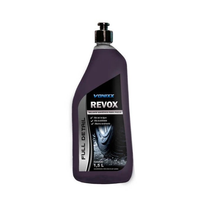 Revox é um selante sintético para pneus, formulado para proteger, dar brilho e renovar o seu aspecto, além de promover total hidrorrepelência. Sua fórmula exclusiva é livre de solventes, ecologicamente correta e não inflamável. Revox é extremamente resistente à lama e chuva, deixando o pneu limpo por mais tempo.