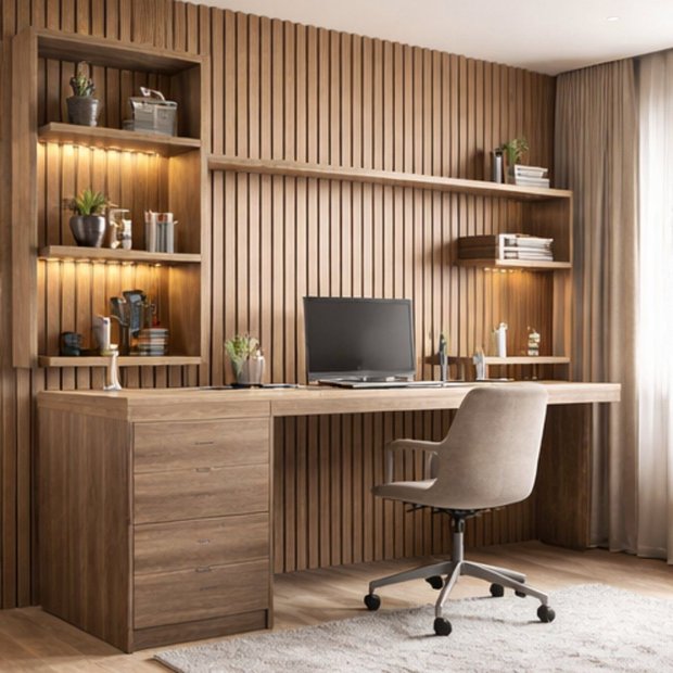 O ripado marrom se adapta facilmente a diferentes estilos arquitetônicos, agregando elegância e profundidade ao ambiente. Seu desenho linear cria um efeito visual moderno, muito utilizado em projetos contemporâneos.