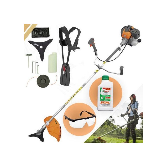 Com guidão ergonômico lateral, permite um alcance amplo e maior mobilidade, capaz de aumentar a produtividade diária. Possui motor 2 tempos á gasolina, de 51,6 Cilindradas (52cc) 10.000 de rotação 2,0 HP de potência que proporcionam maior performance e economia na operação. Seu conjunto de acessórios inclui kit de ferramentas, cinto de sustentação, carretel de nylon e lâmina de corte 3 pontas.