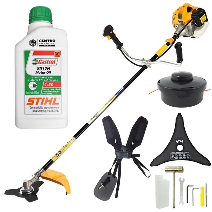 | Acessórios incluídos | 01 lâmina 3 pontas, 01 Óleo de 500ml Castrol Stihl, 01 Carretel, 01 Dosador de Combustível, 01 Cinto de sustentação, 01 Jogo de Chaves com: (1 Chave combinada, 1 Chave fenda, 2 Chaves Allen) |