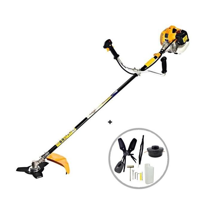 Itens e acessórios na(s) caixa(s): 1 lâmina 3 pontas, 1 Carretel, 1 Dosador de Combustível, 1 Cinto de sustentação, 1 Jogo de Chaves com: (1 Chave combinada, 1 Chave fenda, 2 Chaves Allen)