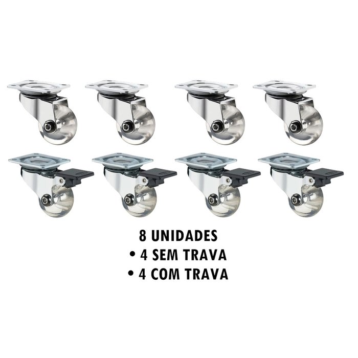 Roda 4 S/ Trava + 4 C/ Trava Rodinhas Giratória S/ Freio Giratória Un 35mm AJB Rodizio com Rolamento Transparente