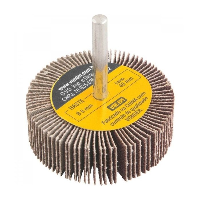 Outras características| Recomendações de Uso, Manutenção e Limpeza | Indicada para lixamentos e acabamentos de superfícies planas, contornos e partes internas em aço, ferro, plástico, alumínio, entre outros. Adaptável em lixadeiras para tornos, furadeiras elétricas e chicotes em geral. |