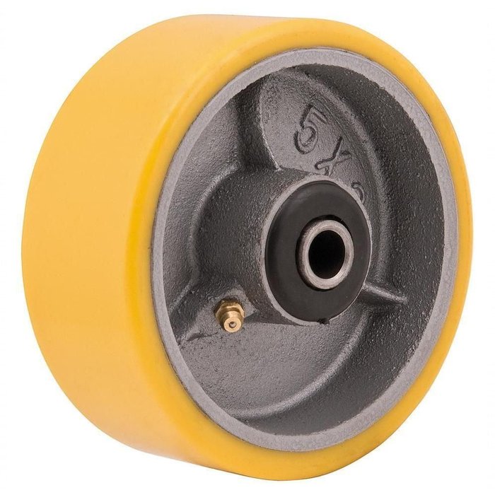 Diâmetro da roda.: 5" - 127 mmLargura da roda: 50,0 mmMaterial da roda.: Ferro fundido + poliuretanoCor da roda: AmareloDiâmetro do eixo da roda.: 19,0 mmTipo do eixo da roda: Com rolete/buchaCapacidade de carga da roda: 220 kg Produto: Roda