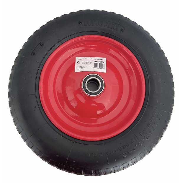Roda Para Carrinho De Mão Rolamento 3,25 X 8'' 100 kgDiamento interno do rolamento: 1" (25,5mm)Possui 2 rolamentos.Capacidade 100KgEixo: 1"Roda completa com pneu e câmara.- Pneu 4 Lonas, super resistente (As 4 lonas, camadas de tecido revestidas com 30% de borracha e fios de nylon TOP 1260, formando a carcaça do pneu, fornecem mais firmeza e maior resistência ao peso, atrito e abrasão por muito mais tempo).- Roda com rolamentos (tipo rolimã) aço carbono GB6005 2RS, diâmetro central 1", espessura 15mm, solda super reforçada entre os aros (O uso de rolimã, ao invés de rolete ou eixo livre; a espessura da chapa; a densidade da solda; e a pintura eletrostática produzem uma aro exclusivo, com direção suave, beleza e resistência singulares)- Câmara de ar, com resistência a tração de 10 mPa, alongamento máximo de 400 %, pressão máxima de 25 lbf/pol2 , bico de ar soldado por auto compressão, fabricada em borracha especial, não estoura, não resseca, não solta o pino de entrada de ar e colagem do bico por auto compressão, acondicionados em saco plástico individual (somente devem ser enchidas dentro do pneu, que a protege, e cm pressão máxima de 25 PSI, evitando-se assim bolhas e estouro)