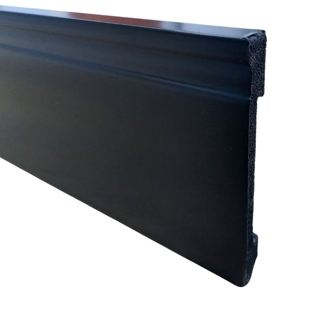 Rodapé de poliestireno preto frisado com 10 cm de altura, na barra de 2,40 metros. O acabamento frisado confere um visual marcante, ideal para ambientes com estilo moderno ou de contraste. Produzido em poliestireno de matéria-prima virgem, esse rodapé é resistente à umidade, não apodrece, não sofre com cupins ou mofo, e já vem pronto para instalar — não necessita de pintura.