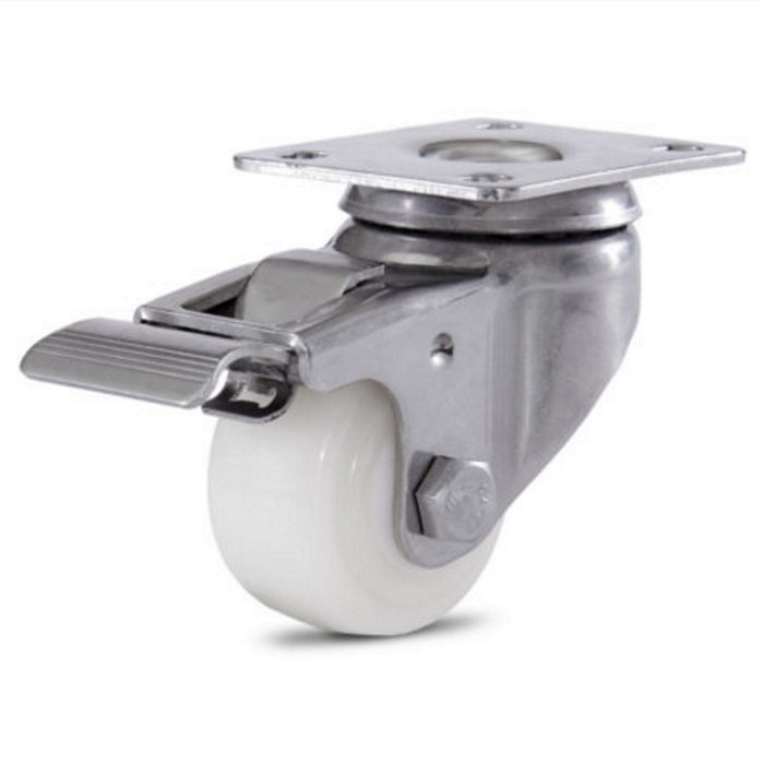 Rodizio giratório inox Colson é indicado para movimentação de móveis, bancadas, carrinhos, entre outros para cargas leves em frigoríficos, indústrias químicas, de alimentos em geral e hospitais. Fabricado em chapa de aço inox (AISI 304) estampado e roda em nylon 100% puro com furo passante Rodizio giratório inox Colson é resistente à corrosão, especialmente desenvolvido para ambientes úmidos e resistente à produtos químicos, o que prolonga a vida útil do produto. Ideais para pisos em concreto liso, cerâmica, aço, metal, madeira, entre outros. Indicado para frigoríficos, cozinhas industriais e residenciais, hospitais, indústria de alimentos em geral, entre outros. Características: - Indicado para ambientes úmidos - Resistente à produtos químicos - Resistente à corrosão - Fabricado em aço inox AISI 304 com dupla pista de esferas - Roda em nylon 100% puro, furo passante. - Roda na cor Branca Informações Técnicas: - Diâmetro da Roda: 2" / 50,80 mm - Raio de giro do rodízio: 55mm - Rolamento: Não Possui - Tipo da Placa: Giratória com Freio - Espessura: 24mm - Material da Roda: nylon 100% puro com furo passante - Altura Total: 75mm - Comprimento Cubo: 29mm - Medidas da Placa: 70x55 mm - Distância dos Furos: 52x36 mm - Diâmetro dos Furos: 9x7mm - Capacidade de Carga: 50 Quilos