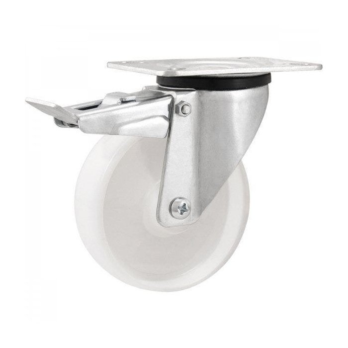 | Informações Complementares | Diâmetro da roda.: 5" - 127 mm | Largura da roda: 40,0 mm | Diâmetro do eixo da roda.: 15,0 mm | Capacidade de carga do rodízio: 150 kg | Material da roda.: Nylon | Cor da roda: Branco | Material da base do rodízio: Chapa de aço zincada | Tipo do eixo da |