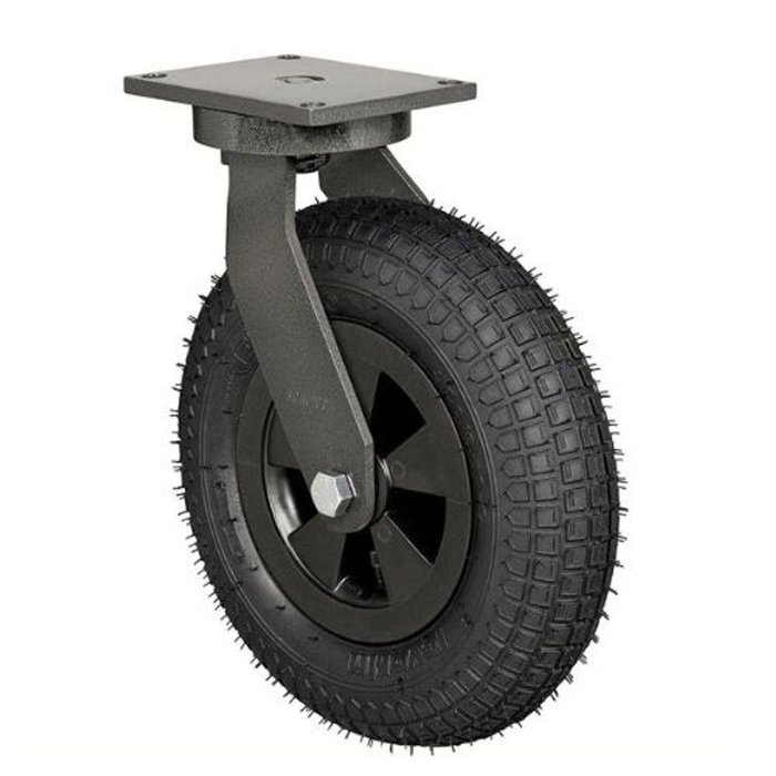 Especificação do Rodizio Pneumático 350-8Rolamento do Garfo: Rolamento axial 51105;Eixo: Parafuso Sextavando 3/4” x 6” unc;Manga de Eixo: Nylon;Dimensões gerais:Largura da roda: 95 mmDiâmetro da roda: 385 mmAltura Total: mmCapacidade de carga: 220kgPeso Total por Rodizio: 8.500 kgAltura até o centro do eixo: 121mm;Raio de giro até o centro do eixo: 118mm;Dimensões da placa: 200mm x 150mm;Distância entre furos: medida mínima 145mm x 125mmMedida máxima 157mm x 125mmFuro ø13mm;Diâmetro do eixo: 19,5mm;Calibragem: 50 LBGARFOReforçado, fabricado em aço carbono SAE 1010/20 com peças estampadas e usinadas, cabeçote com dois rolamentos axiais de esferas. Acabamento pintado de cinza martelado. Eixo da roda parafusado. Graxeira da lubrificação e o giro é feito através de uma pista de esfera e rolamento axialPP – Pneumáticas – Núcleo de Nylon. (-20°C a +50°C). Fabricadas com pneu 4 lonas, câmara de ar e núcleo injetados em nylon. Indicadas para aplicações em pisos irregulares onde é necessário facilidade de movimentação e amortecimento dos impactos e vibrações. Proporcionam fácil manutenção, e seus componentes podem ser fornecidos separadamente. A velocidade de trabalho indicada é até 4 km/h
