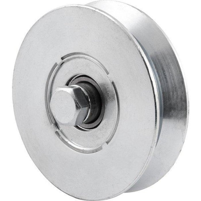 Produzida em aço 1020 com rolamento em aço cromo, conferindo maior resistência mecânica. Possui acabamento zincado, aumentando a proteção contra a oxidação. Para maior proteção do rolamento, é colocado um anel de aço 1020 sobreposto ao mesmo. A fixação da roldana no portão é feita através de bucha e parafuso.