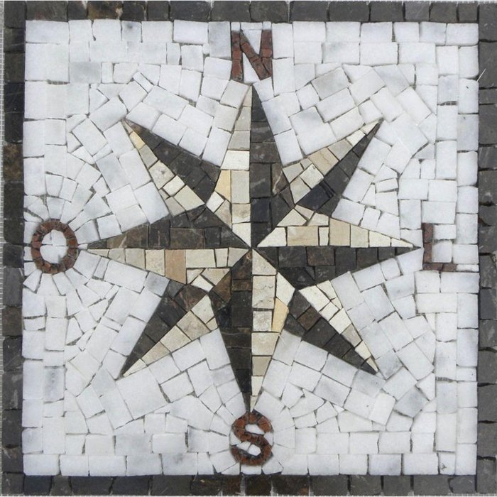 Piso mandala em mosaico feito com pedrasA rosa dos ventos, com suas letras indicando as direções cardeais - norte, sul, leste e oeste - é um símbolo antigo e universalmente reconhecido. Pedras utilizadas: Mármore Marrom Imperador Chinês, Travertino Bege e Mármore Branco. Os tons podem variar conforme o lote das pedrasSignificado da mandala:A rosa dos ventos é um antigo símbolo de orientação amplamente usado na decoração de lares e escritórios. Visualmente, é uma estrela estilizada que representa a certeza de seguir o caminho certo com conhecimento. Numericamente, seu número principal é 4, simbolizando a materialização de ideias, e quando somamos as pontas menores, obtemos 8, associado à prosperidade. Além de sua importância decorativa, a rosa dos ventos é um símbolo de navegação, indicando decisões ponderadas e bons ventos. Ela aponta a direção do norte e a relação entre a Terra, o homem, o sol, a luz e o vento. Essa mandala mantém o foco em objetivos espirituais e materiais, sendo frequentemente colocada na entrada de novos lares para consolidar conquistas. Resumidamente, é um símbolo de orientação, prosperidade e escolhas acertadas. Aplicações: Nossos produtos são entregues montados de fácil aplicação - ideal para ambientes internos e externosEspecificações técnicas do mosaico: Feito com pedras - Mármores e granitos de todo o Brasil e importados da Europa e Ásia - para obter todas as cores desejadas em pedras naturais; Vem todo montado sobre tela, só colocar conforme manual de colocação, Resistência e Durabilidade em área interna e externa; Espessura de 10 mm – Mesma espessura do porcelanato ou piso cerâmico Liso e agradável para uso diário; Mosaico feito integralmente à mão com técnica do mosaico romano;