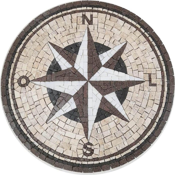 Piso mandala em mosaico feito com pedrasO miolo pode ser recortado, permitindo que possa se orientem nas direções desejadas. A rosa dos ventos, com suas letras indicando as direções cardeais - norte, sul, leste e oeste - é um símbolo antigo e universalmente reconhecido.Pedras utilizadas: Mármore Marrom Imperador Chinês, Travertino Bege, Granito Preto são Gabriel e Mármore Branco. Os tons podem variar conforme o lote das pedrasSignificado da mandala:A rosa dos ventos é um antigo símbolo de orientação amplamente usado na decoração de lares e escritórios. Visualmente, é uma estrela estilizada que representa a certeza de seguir o caminho certo com conhecimento. Numericamente, seu número principal é 4, simbolizando a materialização de ideias, e quando somamos as pontas menores, obtemos 8, associado à prosperidade.Além de sua importância decorativa, a rosa dos ventos é um símbolo de navegação, indicando decisões ponderadas e bons ventos. Ela aponta a direção do norte e a relação entre a Terra, o homem, o sol, a luz e o vento. Essa mandala mantém o foco em objetivos espirituais e materiais, sendo frequentemente colocada na entrada de novos lares para consolidar conquistas. Resumidamente, é um símbolo de orientação, prosperidade e escolhas acertadas.Aplicações: Nossos produtos são entregues montados de fácil aplicação - ideal para ambientes internos e externosEspecificações técnicas do mosaico: Feito com pedras - Mármores e granitos de todo o Brasil e importados da Europa e Ásia - para obter todas as cores desejadas em pedras naturais; Vem todo montado sobre tela, só colocar conforme manual de colocação, Resistência e Durabilidade em área interna e externa; Espessura de 10 mm – Mesma espessura do porcelanato ou piso cerâmico Liso e agradável para uso diário; Mosaico feito integralmente à mão com técnica do mosaico romano;