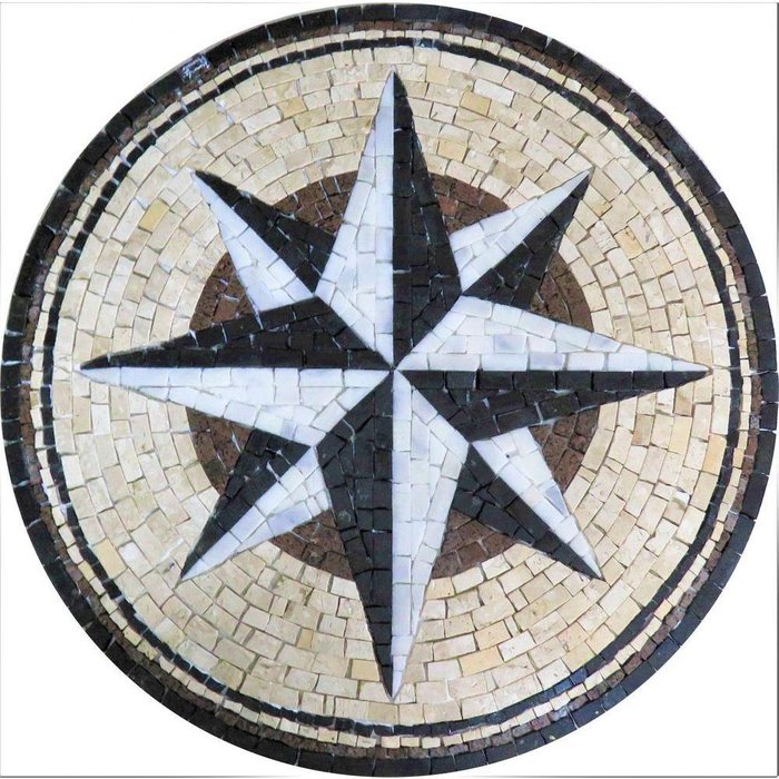 Piso mandala em mosaico feito com pedrasA rosa dos ventos é um símbolo icônico com profundos significados de orientação, objetivos e prosperidade. Pedras utilizadas: Travertino Bege, Granito Preto são Gabriel, Granito Vermelho Guaíba e Mármore Branco. Os tons podem variar conforme o lote das pedrasSignificado da mandala:A rosa dos ventos é um símbolo muito antigo e amplamente utilizado na decoração de lares, prédios comerciais e escritórios. Seu principal significado é a orientação, representando a certeza de seguir o caminho certo quando se possui conhecimento. Além disso, simboliza objetivos e metas. Ela é visualmente uma estrela estilizada, semelhante a um sol, que emana energia em todas as direções. Numericamente, seu número principal, quando consideramos as pontas maiores, é 4, o que representa a materialização de ideias. Quando somamos as pontas menores, obtemos o número 8, associado à prosperidade e abundância. A rosa dos ventos também é um símbolo de navegação, indicando um caminho certo e decisões ponderadas. Ela representa a melhor escolha, a sorte e os bons ventos que favorecem aqueles que a seguem. Além disso, aponta a direção do norte e a relação entre a Terra, o homem, o sol, a luz e o vento. Essa mandala tem um significado fortemente racional e ajuda a manter o foco em objetivos espirituais e materiais. Ela é frequentemente colocada na entrada de novos lares, pois ajuda a consolidar as conquistas. Aplicações: Nossos produtos são entregues montados de fácil aplicação - ideal para ambientes internos e externosEspecificações técnicas do mosaico: Feito com pedras - Mármores e granitos de todo o Brasil e importados da Europa e Ásia - para obter todas as cores desejadas em pedras naturais; Vem todo montado sobre tela, só colocar conforme manual de colocação, Resistência e Durabilidade em área interna e externa; Espessura de 10 mm – Mesma espessura do porcelanato ou piso cerâmico Liso e agradável para uso diário; Mosaico feito integralmente à mão com técnica do mosaico romano;