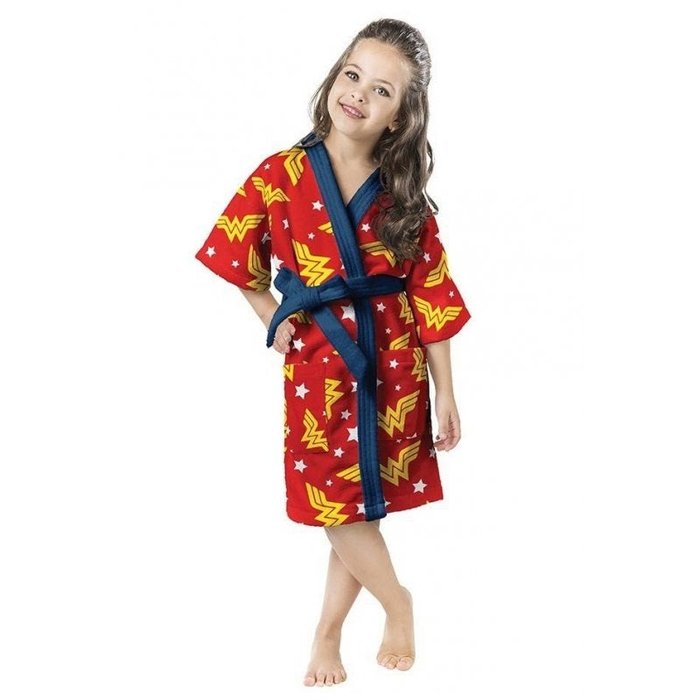 O roupão aveludado da coleção Liga da Justiça traz toda a