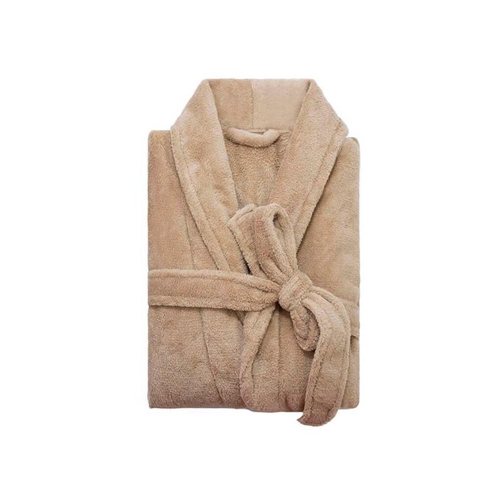 O roupão é feito em microfibra 100% poliéster na cor bege e possui toque extremamente macio, aconchegante e confortável, ideal para todas estações do ano.