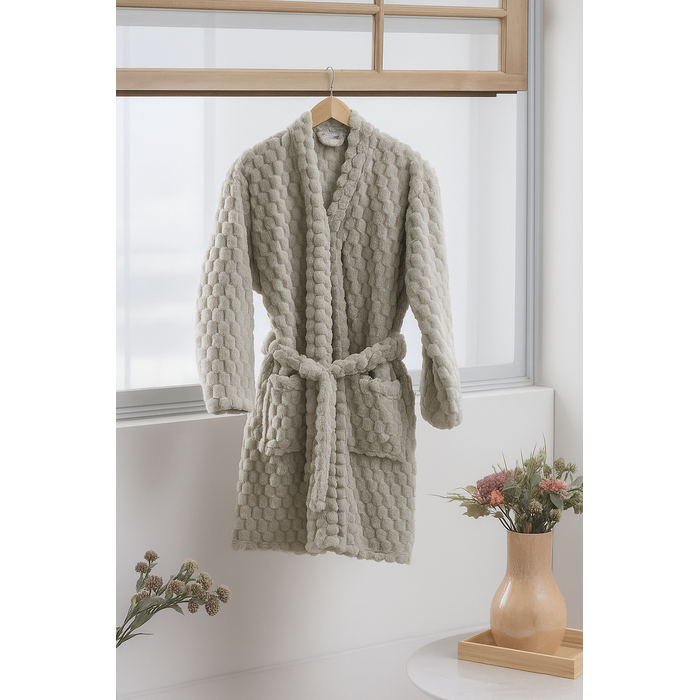 Sua estrutura é em formato de um desing 3D, o que o torna lindo e charmoso. Seu tecido plush Peluciado proporciona um toque incrivelmente macio, que acaricia a pele com delicadeza e aquece na medida certa. Confeccionado em 100% poliéster com gramatura de 280g/m², o roupão une leveza e isolamento térmico, garantindo praticidade e conforto ao mesmo tempo. O acabamento cuidadoso, aliado às cores discretas, traz sofisticação e charme a uma peça essencial para o inverno.