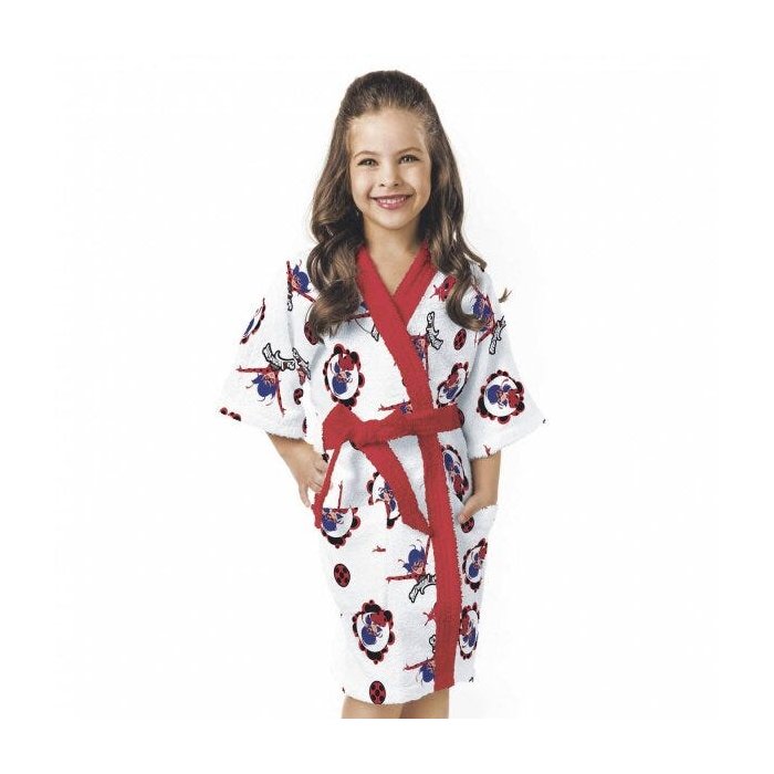 O Roupão Quimono Estampado da coleção Ladybug retrata a heroína em diferentes poses, pronta para mais uma aventura em Paris. Estampa também outros elementos que remetem a série como a mascote Tikki presente em todas as missões e o Miraculous Joaninha que garante seus super poderes. É ideal para enxugar e proteger a garotada após o banho ou piscina. Disponível nos tamanhos: P (4 a 6 anos), M (8 a 10 anos) e G (12 a 14). Apresenta pala e cinto na cor vermelha.