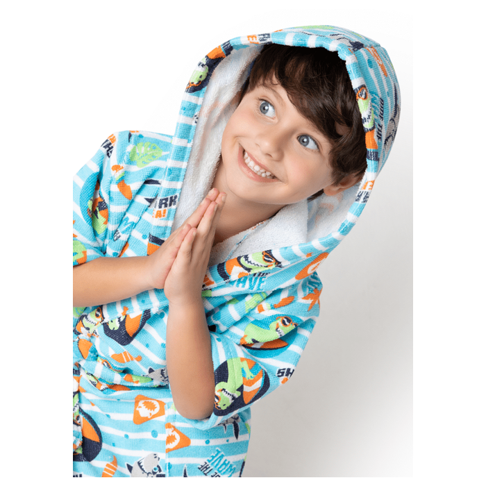 Roupão divertido multibichos com capuz, bolsos, amarração frontal e mangas 3/4 amplas. Ideal para os momentos pós banho, piscina, praia e brincadeiras com água.