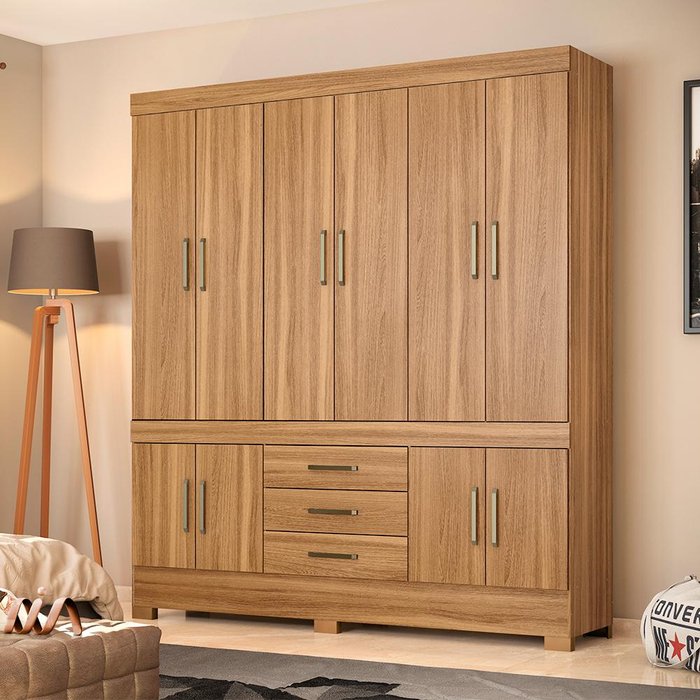 Dimensões do produto: Largura 192 cm; Profundidade 47 cm; Altura 217 cm;Itens Inclusos: 1 Guarda Roupa- Material da estrutura em MDP- 10 Portas com excelente espaço interno- 3 Gavetas com corrediças metálicas- 2 Cabideiros metálicos- Divisórias internas espaçosas- Sapateiras amplas para melhor organização- Puxadores em ABS- Pés em PVC que facilitam a limpeza do ambienteComplexidade da montagem: Média, pode ser montado por mais de uma pessoa e/ou necessite de maior conhecimento para montagem.Recomendações de uso, manutenção e limpeza: Limpar com flanela ou pano macio seco, não utilizar produtos abrasivos, desengordurantes, álcool ou solvente. Não expor o produto diretamente a luz solar e à umidadeGarantia: 3 meses
