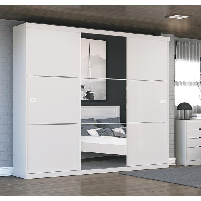 Roupeiro 3 Portas de Correr 3 Gavetas e Espelho S743 Kappesberg - Branco Brilho