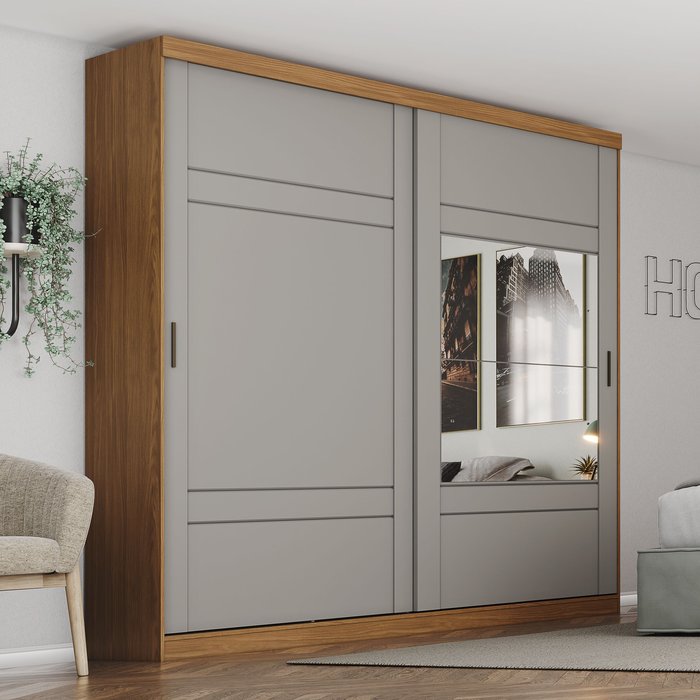 Roupeiro Casal com Espelho 2 Portas Deslizantes 3 Gavetas Del Mare Espresso Móveis Nature/ Cinza