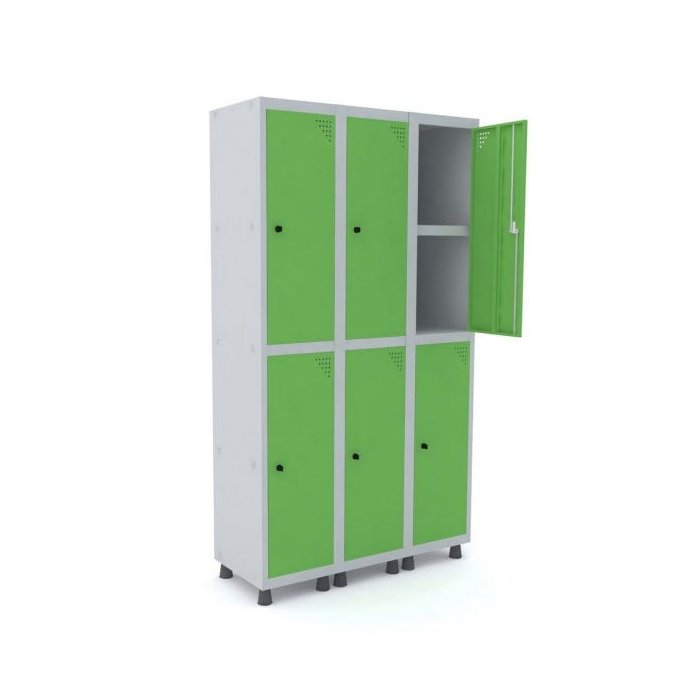 Roupeiro de Aço 3 vãos 6 portas com prateleira interna, fechamento através de pitão para cadeado. Segue as exigências da NR-17.