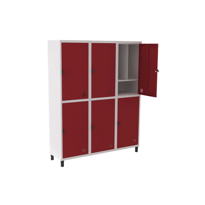 CONEXÃO OFFICERoupeiro confeccionado em chapa de aço de alta qualidade, com 06 vãos sobrepostos e 01 divisão vertical por vão, para separação das roupas (Sujas/Limpas). Sistema de ventilação através de venezianas, reforço nas portas e cabideiro. Suporte para cadeado (pitão). Tratamento fosfatizante anticorrosivo e pintura eletrostática.Ideal para academias, surpermercados, empresa e para uso geral. Produzido em aço chapa 26 0,45mm de alta qualidade com tratamento anti-ferruginoso, o acabamento em sistema de pintura eletrostática a alta temperatura epóxi, tambem garante maior durabilidade da cor e resistencia a ferrugem. Possui 6 portas com venezianas para ventilação, compartimentos de tamanhos médios independentes sem divisórias internas, que garante que você consiga armazenar itens como bolsas, mochilas e entre outros. O fechamento das portas é através de pitão para cadeado.Características- Quantidade de Portas: 6- Cor: Corpo Cinza / Portas Vermelhas- Chapa: 26 / 0,45mm- Sistema de Ventilação: Veneziana- Fechamento: Pitão para Cadeado- Quantidade de cabides por porta: 2- Pés removíveis: Não- Desmontável: Não ( Exceto portas que podem ser trocadas ).- Pintura: Epóxi PóALTURA: 190cmLARGURA: 150 cmPROFUNDIDADE: 42 cmPESO: 50kgGARANTIA: 1 MesesEspecificação de chapa e acabamento: Roupeiro produzido em chapa de aço tratada com antiferruginoso por fosfatização e pintura epóxi-pó por processo eletrostático.Roupeiro Montável (Não Efetuamos a Montagem do Produto)Produto vai com Manual de Montagem