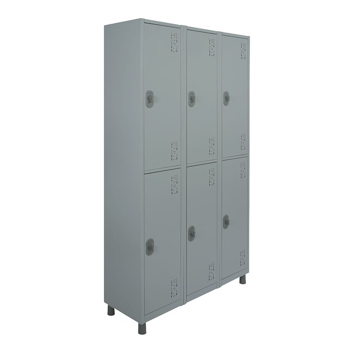 Roupeiro montável com pitão para cadeado. Pés com altura suficiente que fica a uma distância do chão para facilitar a limpeza. Com 06 vãos para o armazenamento de objetos com uma maior capacidade para o seu conforto. Estampas nas portas que permite ventilação e adequada para manipular. Feito de aço que aumenta sua durabilidade e resistência mesmo com o uso constante. Exclusiva carenagem protetiva, pintura texturizada eletrostática a pó.