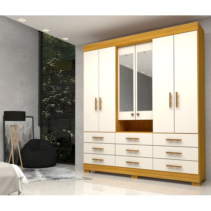 Roupeiro Débora 9 gav capelinha c/esp ACP 100% MDF Roupeiro com 06 portas e 09 gavetas externas, 02 portas centrais recuadas com espelhos.Frente do produto em MDF de 15mm e estrutura em MDF de 12mm, base de 6mm e fundo em MDF de 2,5mm.Pintura interna normal. Corrediças metálicas e Cabideiro em alumínio. Espelhos e Pés inclusosEspelhos parafusados, vão soltos para a montagem. Altura 2100 mm Largura 1788 mm Profundidade 400 mm Peso 115 kg Imagens meramente ilustrativas, objetos não acompanha o produto.