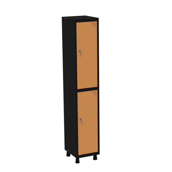 Armário Roupeiro de Aço totalmente montável, dispensa a utilização de parafusos, estrutura em chapas #24 e #26 (0,60mm e 0,45mm) conta com uma porta com estampos circulares em formação triangular para ventilação, sistema de fechamento de varão de 3 pontos, através de pitão para cadeado.