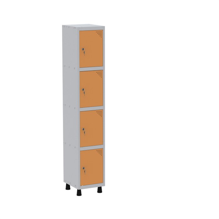 Armário Roupeiro de Aço totalmente montável, dispensa a utilização de parafusos, estrutura em chapas #24 e #26 (0,60mm e 0,45mm) conta com uma porta com estampos circulares em formação triangular para ventilação, sistema de fechamento de varão de 3 pontos, através de pitão para cadeado. Em conformidade com as normas NR17.
